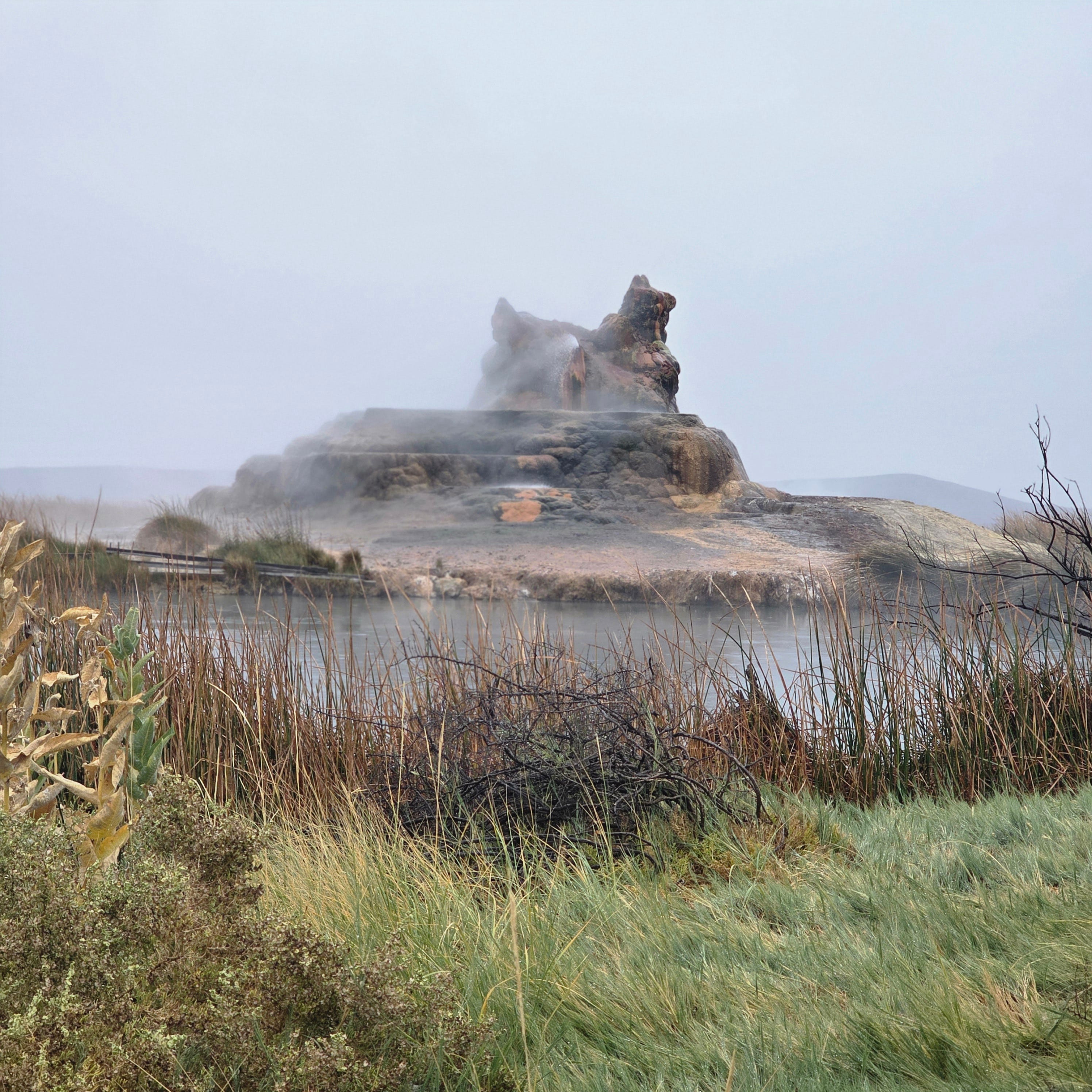 When we finally disembarked, it felt like stepping onto another planet. An overcast layer had settled like a blanket, trapping the heat close to the ground. Steam rose from every direction, reeds bending in the wind, and in the distance a geyser shaped like a lion’s head spewed clouds into the sky. The air was thick with minerals and the promise of rain. My friend opened a white umbrella dotted with polka dots, and we used it to shield ourselves as we picked our way carefully through the mud.