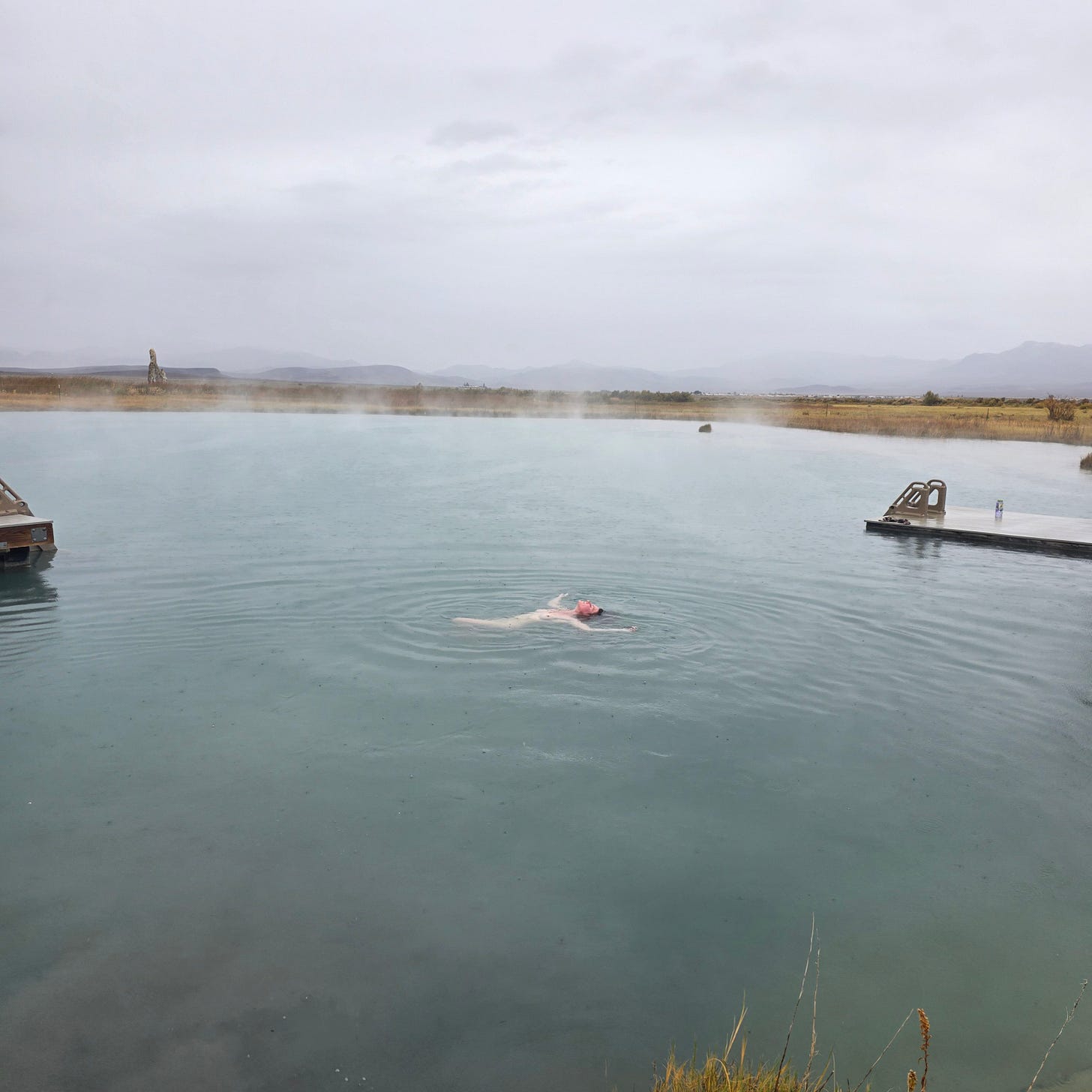 I found two pool noodles, put one under my neck, one under my knees, and floated into the middle of the spring. The steam blurred everything. The sky. The water. My body.